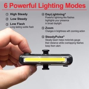 - VERSATILE NIGHT & DAY MODES – 5 Night modes cover any speed and terrain, 3 unique Flashing Day modes make you stand out in high city traffic and open country roads, 1 Walking Flashlight mode for handy use. WHEN BATTERY IS LOW THE LIGHT FLASHES EVERY 25 SECONDS indicating 10 to 20 minutes of runtime left